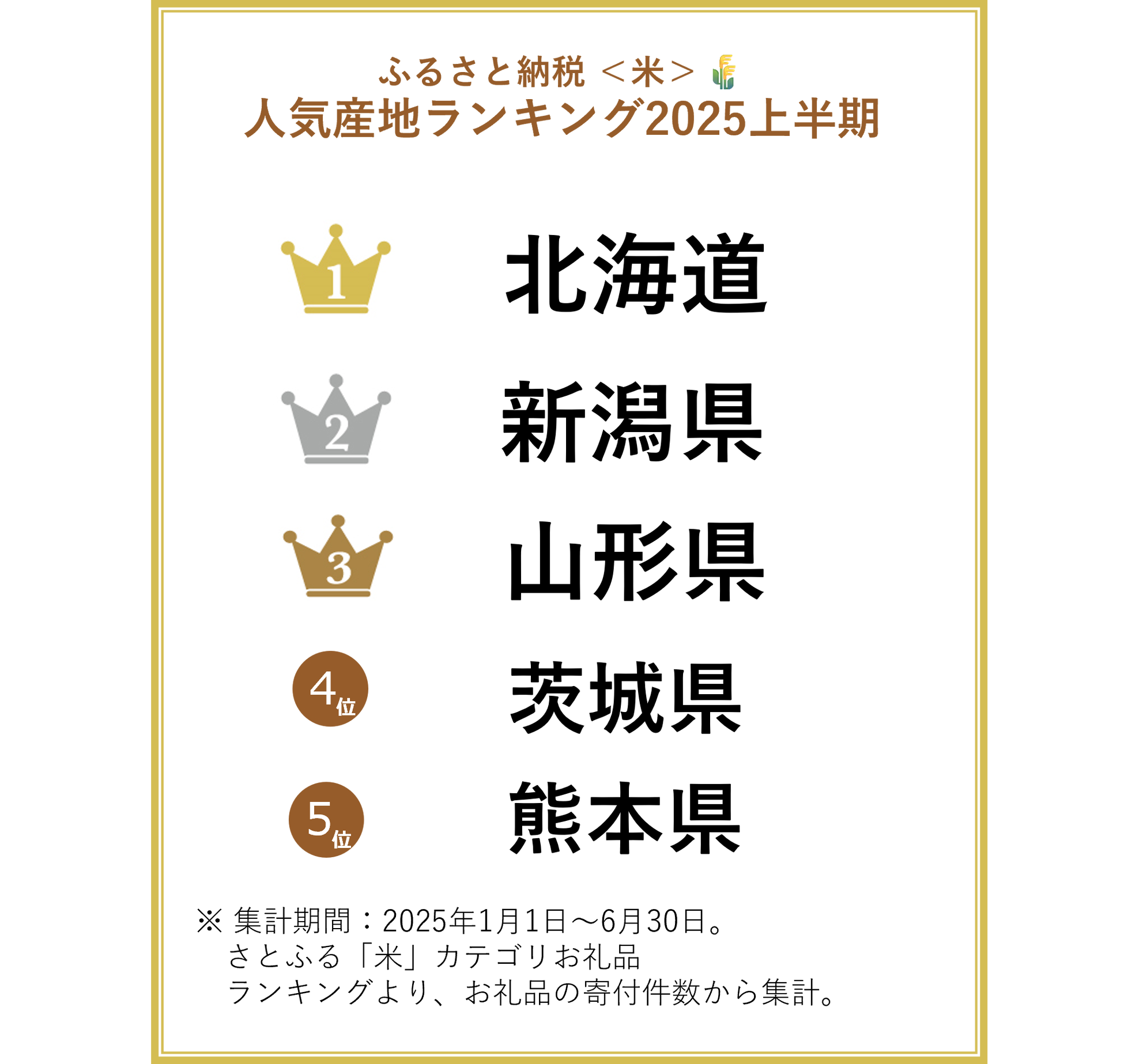 TOPIC1 2025年上半期「米」人気産地ランキングでは、前年同期比1.6倍超の寄付件数となった北海道が堂々の1位に!昨年TOP5圏外だった茨城県が4位に急浮上!