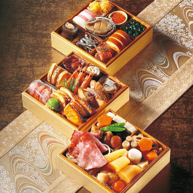 鹿児島県産ブリの照り焼き、丹波篠山産黒豆、栗きんとん(安納芋使用)、数の子松前漬け、有頭海老の艶煮、帆立貝柱煮、いくら醤油漬け等