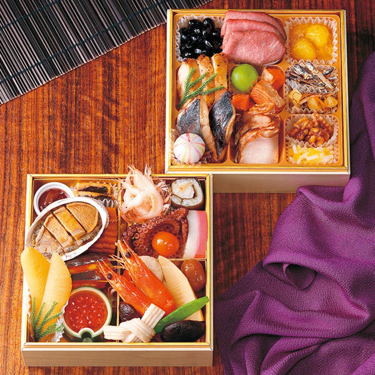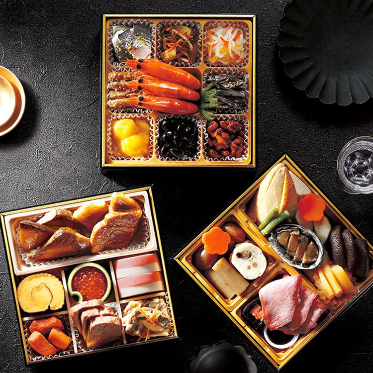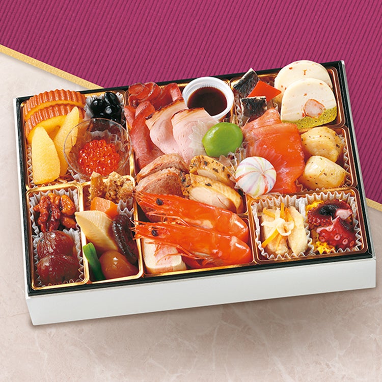 三陸産鮑うま煮、都城和牛ローストビーフ、丹波篠山産黒豆、鹿児島県産ブリの照り焼き、北海道産数の子、栗きんとん(鹿児島県産べにはるか使用)、北海道産いくら醤油漬け等
