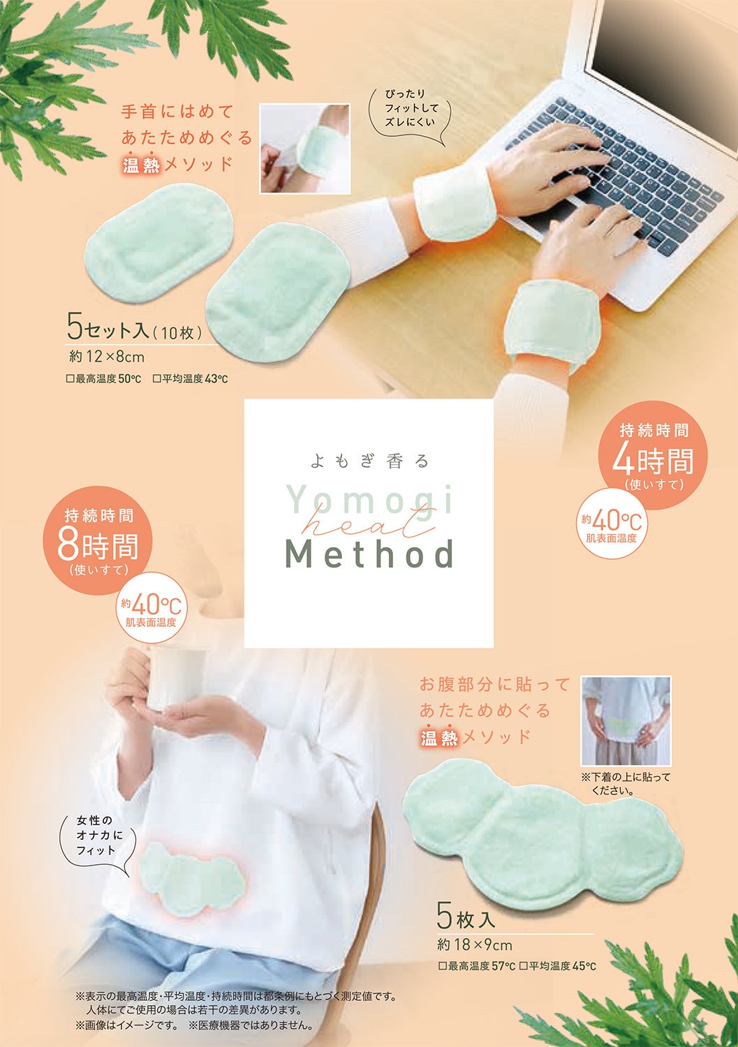 リストバンド型の温熱ケア。手首にぴったりフィットしてズレにくく、デスクワーク中や家事の合間にも快適に使用できます。使い捨てタイプで、よもぎのほのかな香りとともに、手首を約40℃のやさしい温度で約4時間しっかり温めます。