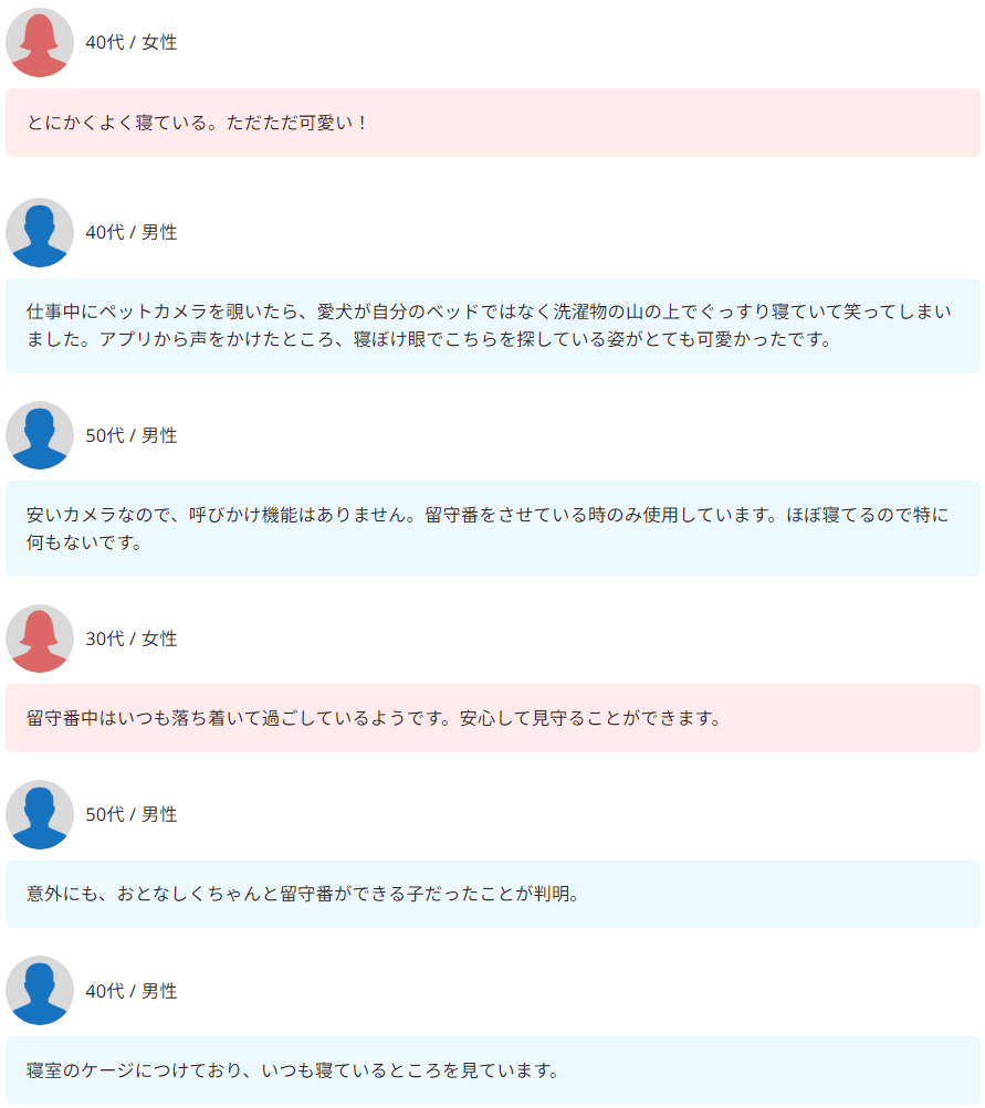 ペットカメラで確認したところ、愛犬は「よく寝ている」「静かに過ごしている」との声が目立ちました。