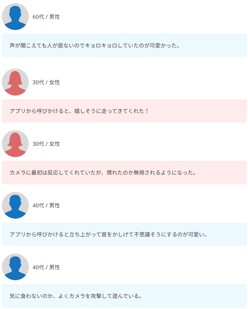 駆け寄ったり首をかしげたり、時にはカメラにちょっかいを出す姿も。呼びかけ機能を使って交流を楽しむ飼い主さんも多くいます。