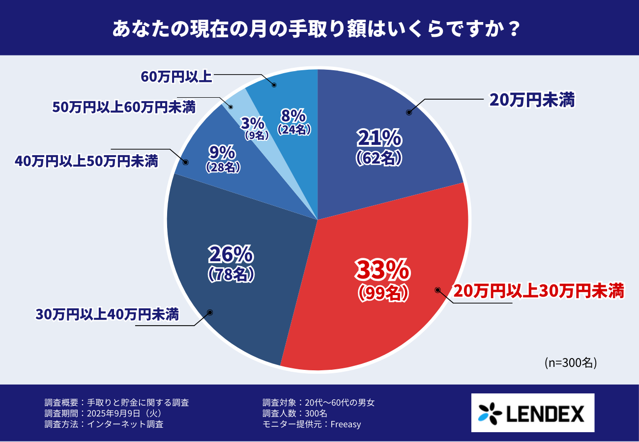 そこで株式会社LENDEX(本社:東京都渋谷区、代表取締役:中村 智)は、20〜60代の男女300名を対象に「月々の手取り額と貯金実態」に関するアンケート調査を実施しました。