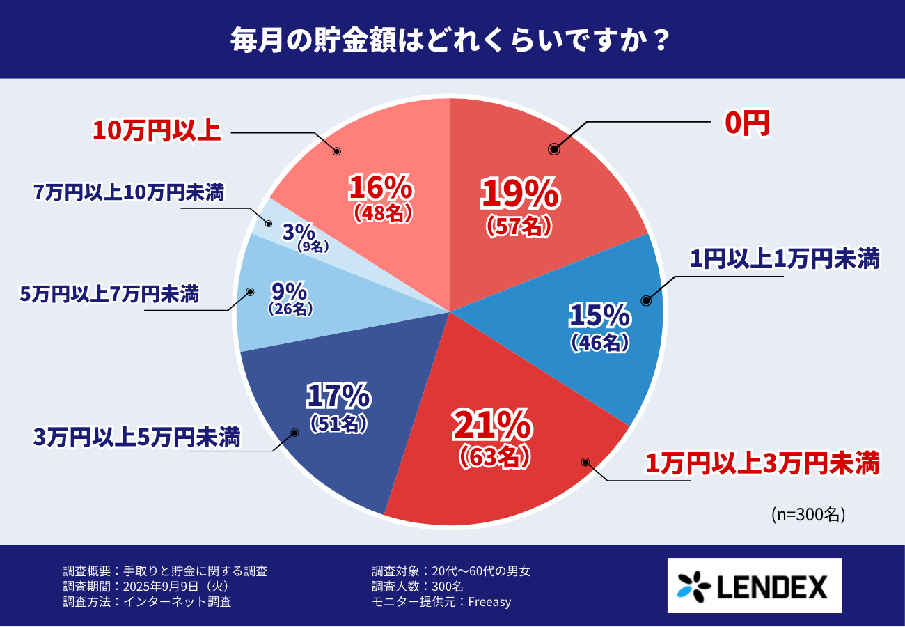 毎月の貯金額0円は約2割!LENDEXが貯金実態調査を発表(2025年9月情報)