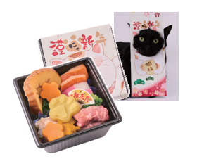 ねこちゃんが喜ぶ素材を詰め込んだ、特別おせち。パッケージを切り抜いて「謹にゃ新年」の顔ハメをして楽しめます。
