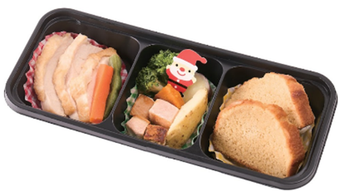 テリヤキ風チキンステーキ、温野菜、サーモンステーキ、米粉のパウンドケーキなど、クリスマスのディナーに相応しい贅沢なオードブル。