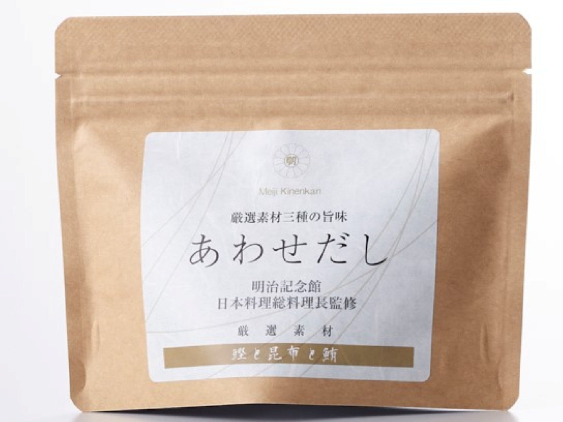 明治記念館の料理人が使用している一番だしを基本とし、鰹・昆布・鮪を絶妙な配合でご家庭用にアレンジした本格的な香りと旨味をお愉しみください。