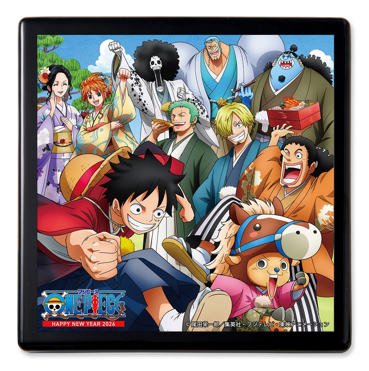 麦わらの一味が晴れ着を身にまとい、楽しく賑やかなお正月! 加賀の石川塗で仕上げられた重箱です。(素材:ABS樹脂 外寸19.8×19.8cm 日本製)