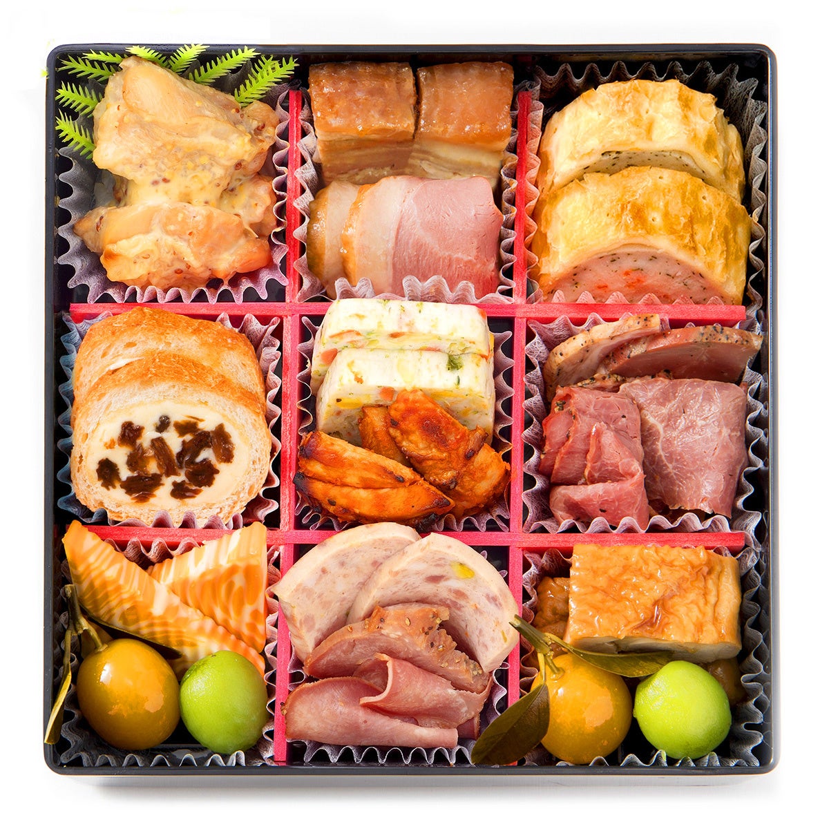 ●ハニーマスタードチキン ●豚角煮 ●合鴨スモーク ●カニとクリームソースのパイ包み ●レザンアルメット ●サーモンのテリーヌ ●鶏もも肉のトマト&バジル ●黒糖ローストポーク ●パストラミビーフ ●マーブルチーズ ●葉付金柑 ●若桃の甘露煮 ●ミートローフ ●塩ポークタン ●鶏もも肉照焼