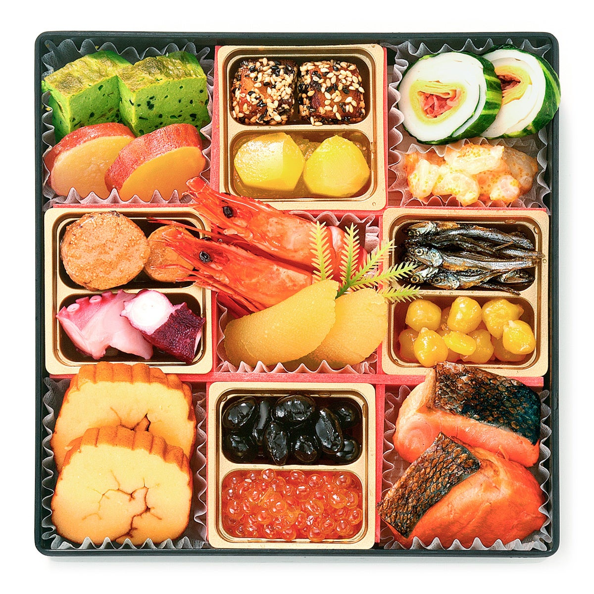 ●抹茶ふくさ焼 ●鳴門金時芋煮 ●唐芋ごま甘露煮 ●栗の甘露煮 ●きんとん ●青菜巻 ●小海老の魚卵和え ●魚卵の旨煮 ●真蛸梅酢味 ●有頭海老煮 ●数の子 ●田作り ●ひよこ豆 ●伊達巻 ●黒豆 ●いくら醤油漬 ●紅鮭の西京焼
