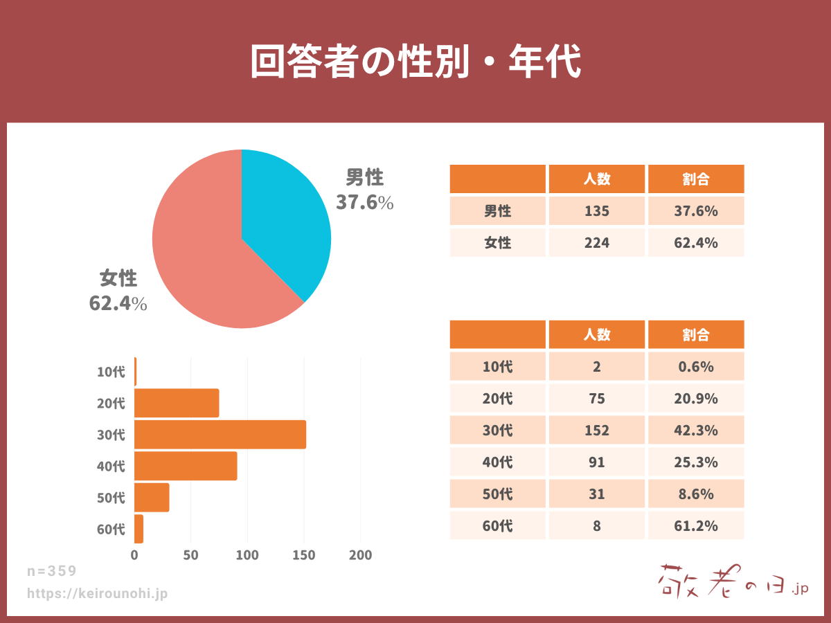 敬老の日に特化したメディアサイト「敬老の日.jp」が、全国の10代から60代の男女計359名を対象に敬老の日に関するアンケート調査を実施し、その結果を公開しましたので、ご紹介いたします。