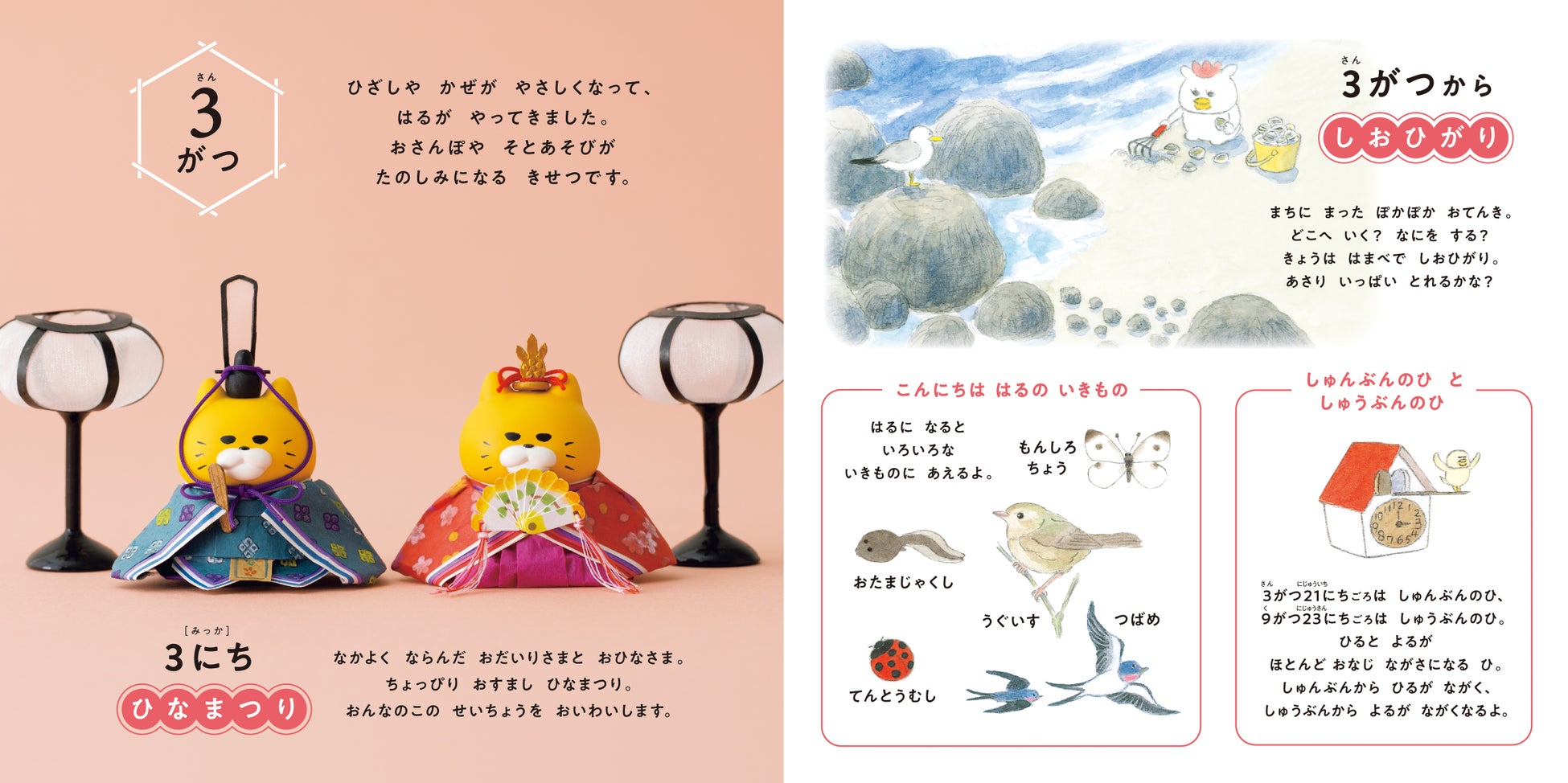 この絵本は、日本の四季折々の行事や自然の魅力を紹介する内容となっており、1月のお正月や2月の節分、3月のひなまつりなど、季節ごとのイベントを中心に、時期に応じた草花や旬の食べ物も取り上げています。